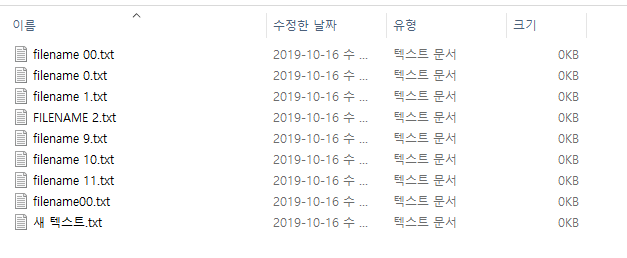 - 숫자는 숫자형으로 비교되지만 같으면 더 긴 문자열이 우선된다. (filename00.txt, filename0.txt 순서임)
